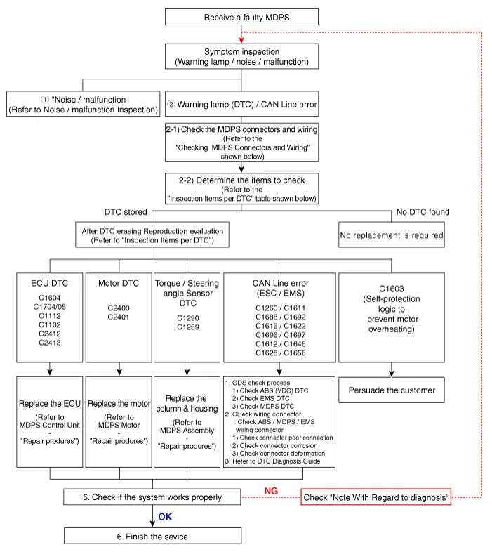 | ECU/Motor | C2412 | Motor current error | Inspection the Motor/ECU connector after Clear DTC. | First ECU replacement Replace Motor if phenomenon persists |