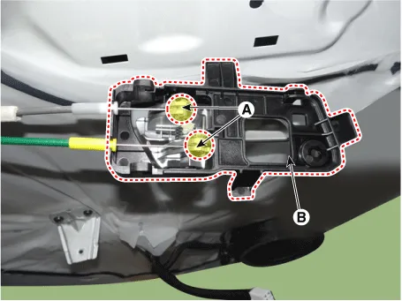 | 3. | Remove the front door inside handle (B) after disconnecting the cable (A).