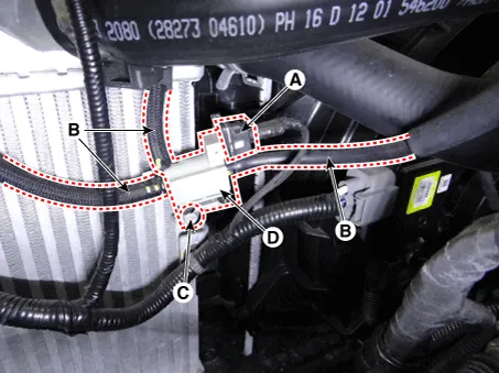 | 2. | Disconnect the RCV control solenoid valve connector (A) and vapor hoses (B). |