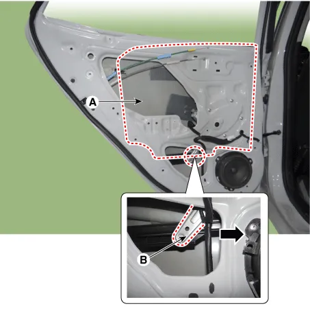 | 3. | Remove the front door inside handle (B) after disconnecting the cable (A).