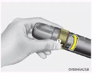 Fog lights are used to provide improved visibility when visibility is poor due to fog, rain or snow, etc. The fog lights will turn on when the fog light switch (1) is turned on after the parklight is turned on.