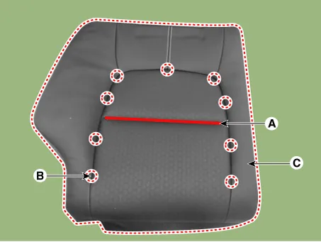 | 13. | Remove the front seat back covering (C) after removing the velcro tape (A) and hog-ring clip (B).