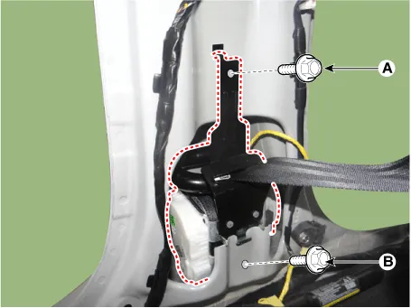 | 5. | Loosen the seat belt pretensioner bolts (A,B).