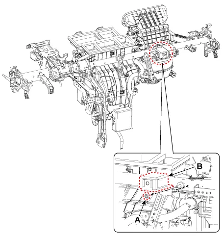 | 3. | Remove the seat belt reminder unit (B) after loosening the mounting nut (A).