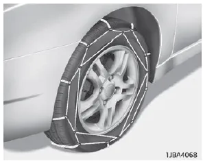 Since the sidewalls of radial tires are thinner, they can be damaged by mounting some types of snow chains on them. Therefore, the use of snow tires is recommended instead of snow chains. Do not mount tire chains on vehicles equipped with aluminum wheels; snow chains may cause damage to the wheels. If snow chains must be used, use wire-type chains with a thickness of less than 15 mm (0.59 in). Damage to your vehicle caused by improper snow chain use is not covered by your vehicle manufacturers warranty. Install tire chains only on the front tires.