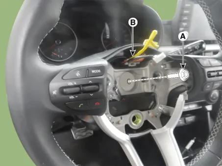 | 4. | Remove the steering wheel lock bolt (A) and clock spring connector (B) from the steering wheel.