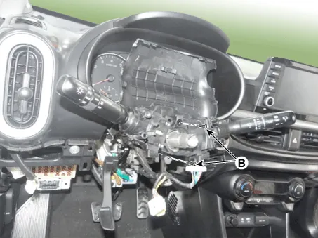 | 8. | Disconnect the multi funtion switch connector (A) and then loosen the screws (B).