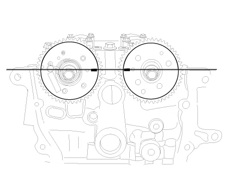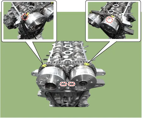 the mark of the exhaust camshaft sprocket and intake CVVT on the top
