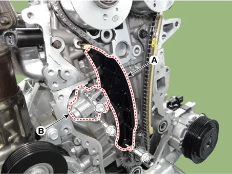 | 4. | Remove the timing chain auto tensioner (A) and then remove the tensioner arm (B).