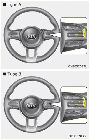 1. Press the cruise / CRUISE button on the steering wheel, to turn the system on. The cruise indicator light will illuminate. 2. Accelerate to the desired speed, which must be more than 30 km/h (20 mph).