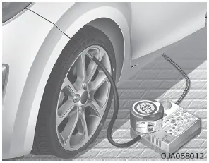 9. With the engine start/stop button position on or ignition switch position on, switch on the compressor and let it run for approximately 5~7 minutes to fill the sealant up to proper pressure. The inflation pressure of the tire after filling is unimportant and will be checked/corrected later.