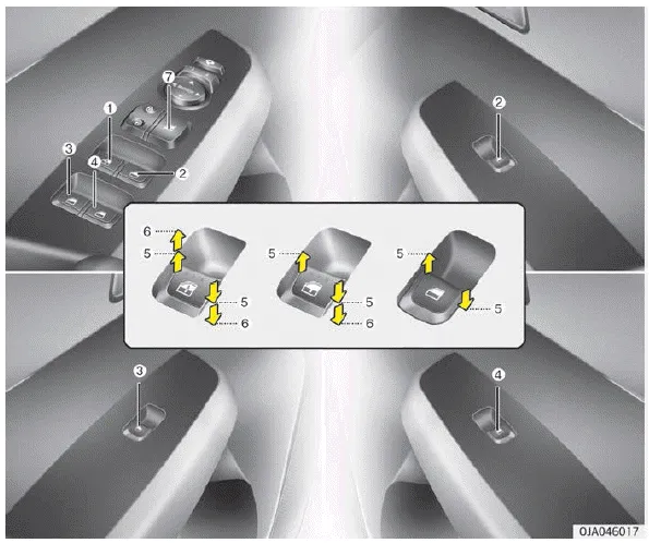 The ignition switch must be in the ON position for power windows to operate. Each door has a power window switch that controls the door's window. The driver has a power window lock switch which can block the operation of rear passenger windows.